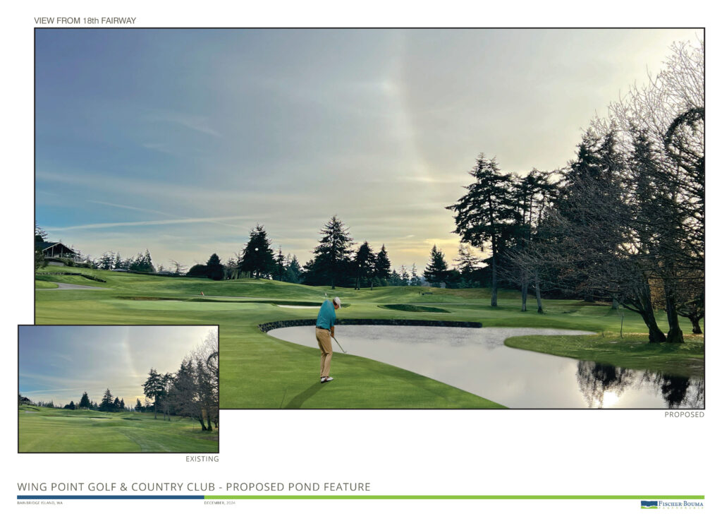 We are proposing to meet the code requirements related to stormwater with the construction of a detention pond to handle the hardscape and new construction buildings and water detention. You can see the pond located (proposed) on the west end of the 18th fairway and green complex. Plan renderings are shown below.